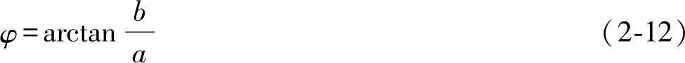 复数的实部 a 和虚部 b 与矢量模 A 和辐角 φ 之间的转换关系为