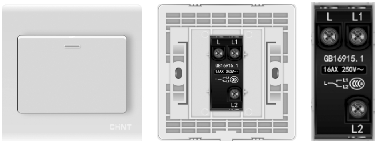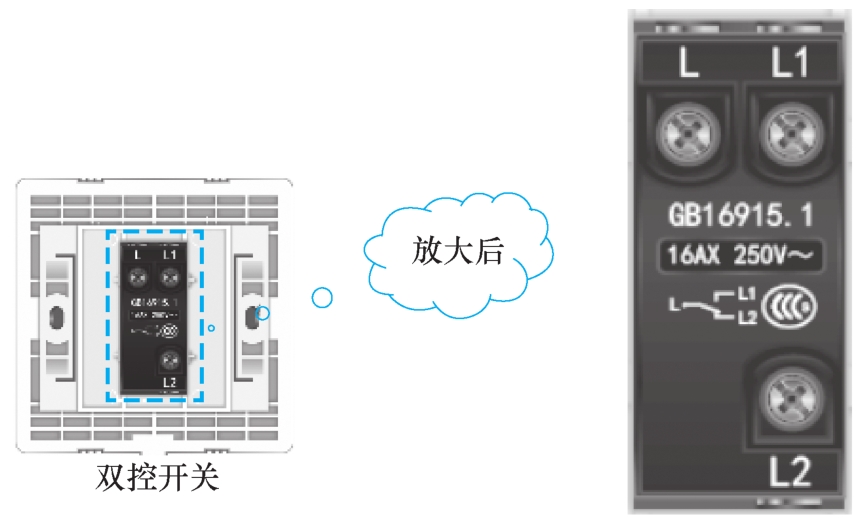 图2-20 双控开关实物图、反面示意图