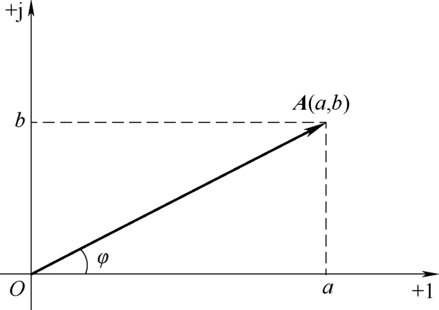 如果用有向线段把坐标原点 O 和该确定点 A 连接起来,在线段末端加上带箭头的符号,则该有向线段成为一个矢量。该矢量就与复数 A 对应,称为 复数矢量 。式(2-10)又称为复数的 直角坐标形式 。