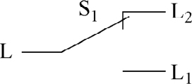 双控开关,也称 单刀双掷开关 (Single Pole Double Throw,SPDT)。图形符号如图2-19所示,有三个接线端,分别是L、L 1 、L 2 ,当将L、L 2 接入回路中时,若触头在L、L 2 之间,则回路接通;当触头在L、L 1 之间,则回路断开。家庭照明电路中使用的双控开关在仿真软件中的实物图(正反面)如图2-20所示。