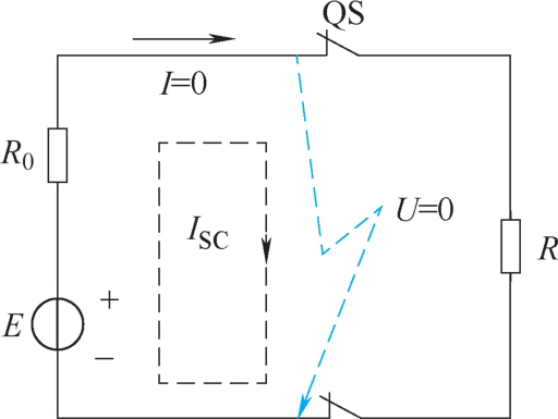 从广义上说电路的任何一部分被电阻等于零的导线连接起来(图1-32中虚线连接部分),使该电路两端电压等于零,这种现象称为短路。图1-32所示是电源两端被短路的情况,其中, E 为电源电动势, R 0 为电源的等效内阻,QS为开关, R 为负载, U 为负载端电压, I 为流过负载的电流, I SC 为短路电流。