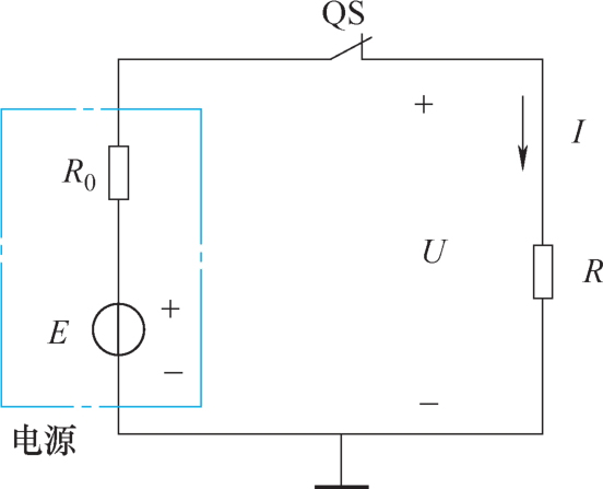 当负载不用电或者检修电源设备及排除电路故障时,都需要把负载与电源隔开,如图1-31所示, E 为电源电动势, R 0 为电源的等效内阻,QS为开关, R 为负载。负载与电源之间用开关QS隔开,电路的这种状态称为开路,又称断路。
