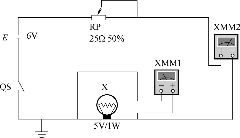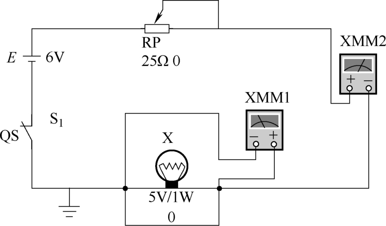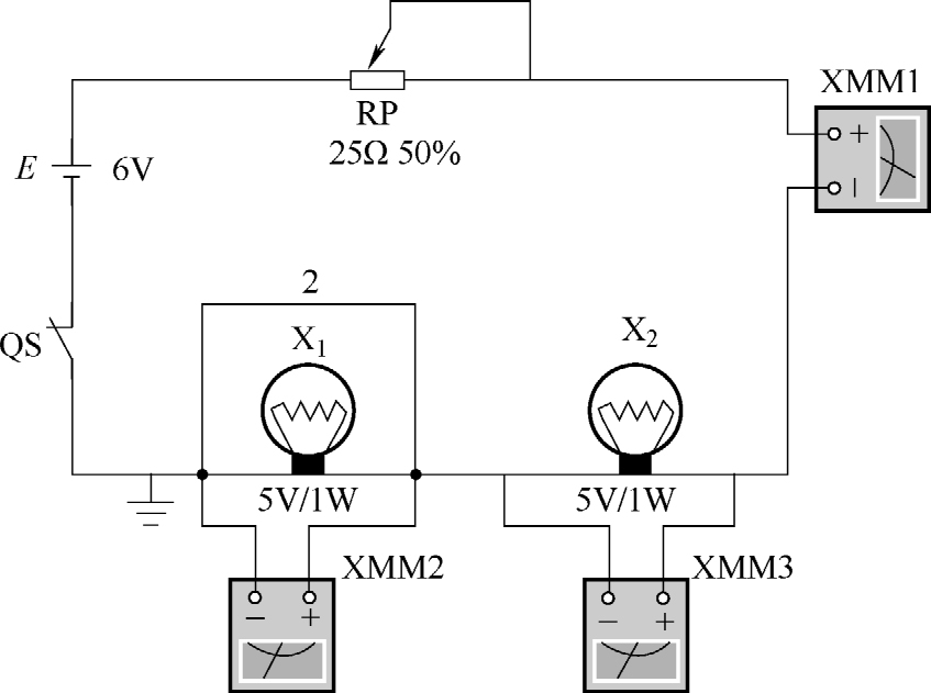 4)如图1-30所示,开关QS闭合,电路中串联两个白炽灯X 1 、X 2 ,其中白炽灯X 1 用导线短接,电路中三个万用表的数值是多少(假设电位器RP的调节量 α =50%)?其中万用表1(XMM1)测量电路中的电流,万用表2(XMM2)测量白炽灯X 1 的端电压,万用表3(XMM3)测量白炽灯X 2 的端电压。