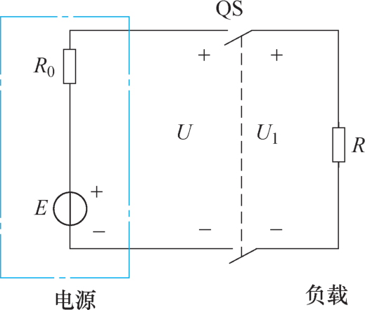 如图1-34所示,当开关闭合,电源与负载接通,电源向负载提供电功率,这种状态就是负载工作状态。其中, E 为电源电动势, R 0 为电源的等效内阻,QS为开关, R 为负载, U 为负载端电压, I 为流过负载的电流。