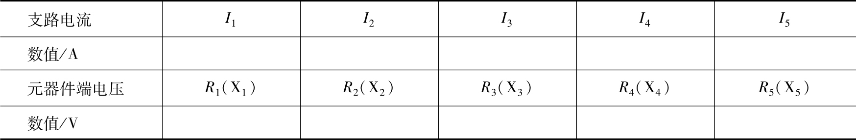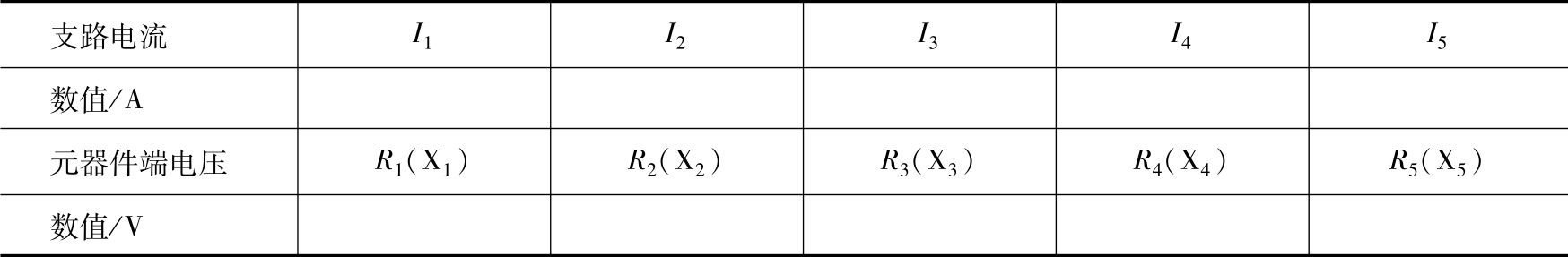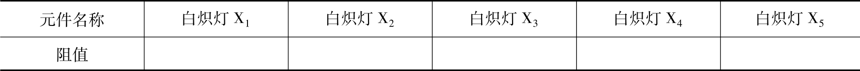 5)支路电流 I 1 、 I 2 、 I 3 、 I 4 、 I 5 分别为流过白炽灯X 1 、X 2 、X 3 、X 4 、X 5 的电流。代入参数,联立求解各电参数并填入表1-13中。