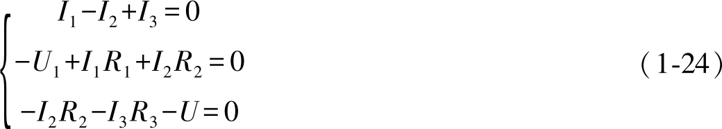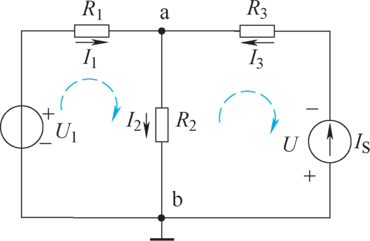 以图1-44为例,求解各支路的电流和电流源的端电压,已知电压源 U 1 、电流源 I S ,以及线性电阻 R 1 、 R 2 和 R 3 。