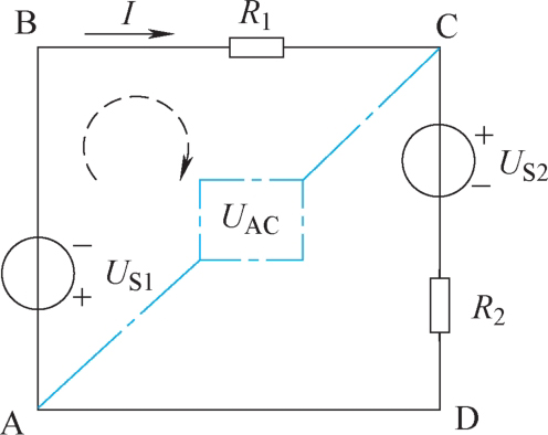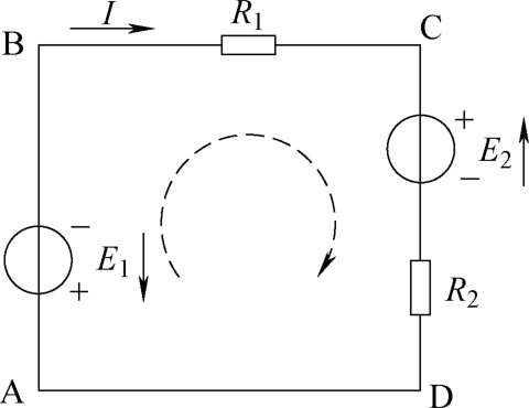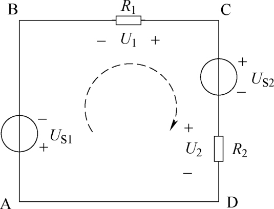 以图1-41所示电路为例,从A点出发,取顺时针方向为绕行方向(如图中虚线所示),绕行一周,再回到A点。