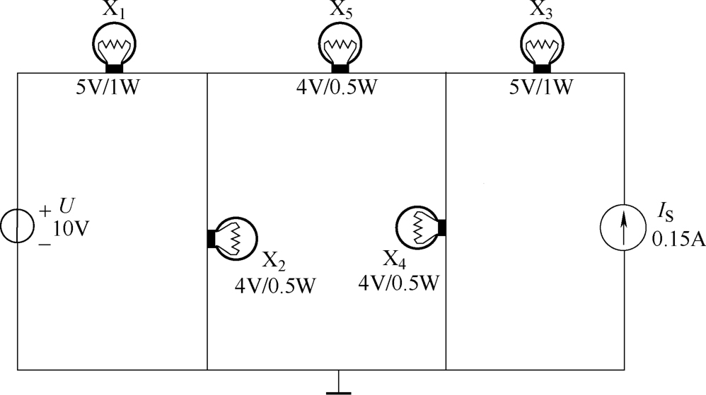 复杂电路示例如图1-36所示, U =10V, I S =0.15A,X 1 、X 3 为5V/1W的白炽灯,X 2 、X 4 、X 5 为4V/0.5W的白炽灯。计算流过各白炽灯的电流和各白炽灯的端电压及电流源的端电压,分析各白炽灯的工作状态。