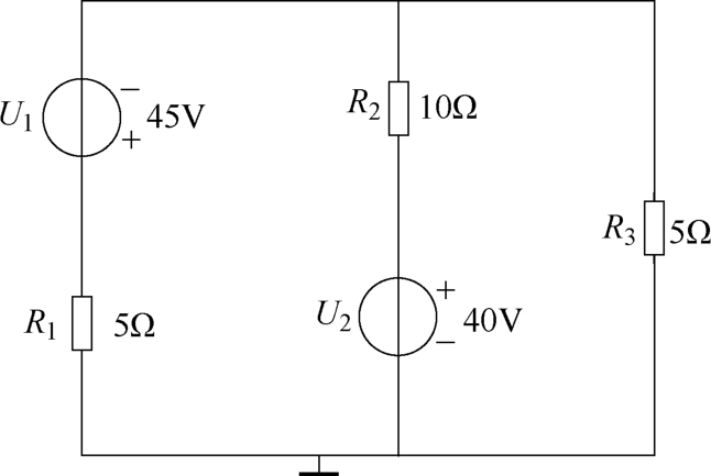 电路如图1-45所示,已知 U 1 =45V, U 2 =40V, R 1 = R 3 =5Ω, R 2 =10Ω,用支路电流法计算各支路的电流。
