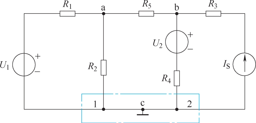 2)节点: 三条或三条以上支路的交汇点。图1-38中,a、b均为节点,但1、2之间是一条电阻为零的导线,两者是等电位点,从电气特性上看是同一点,我们将其标注为c,c也是一个节点。