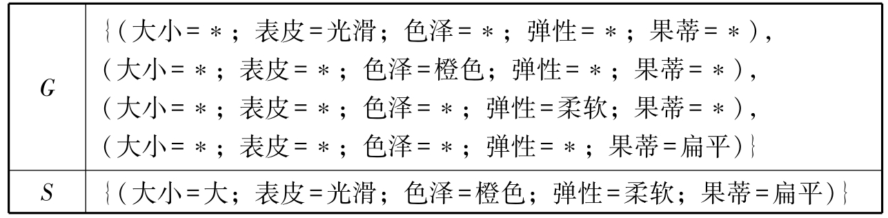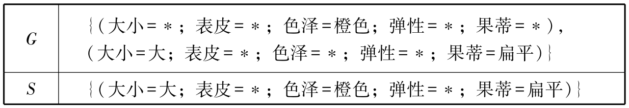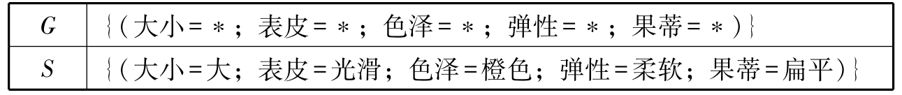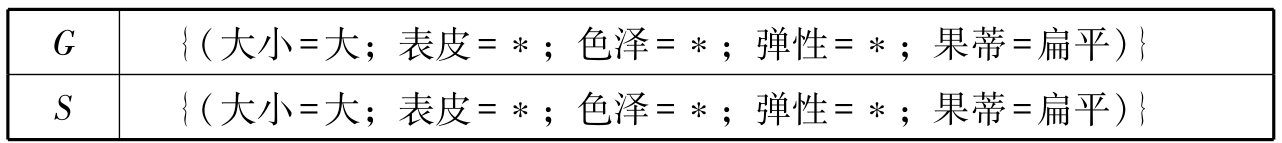 此时所有样例都被遍历过一遍,且集合 G = S .因此,橘子数据集所对应的版本空间为{(大小=大;表皮=*;色泽=*;弹性=*;果蒂=扁平)}.