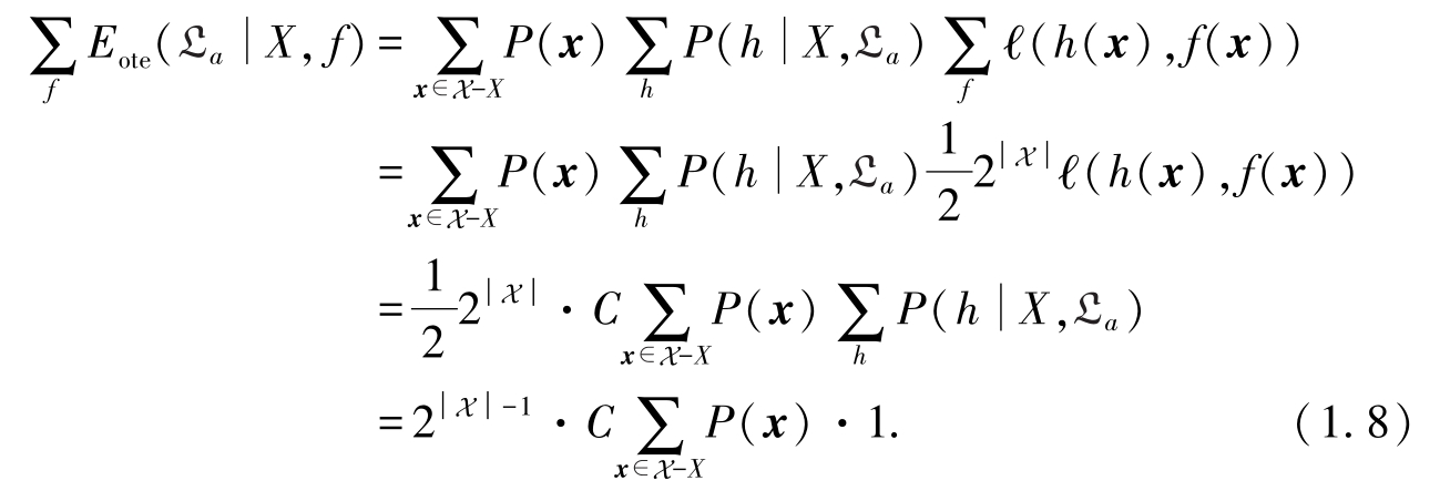 1. 首先回顾当使用“分类错误率”作为性能度量来评估分类器时NFL的证明方式.令 X 表示样本空间, X 表示训练集,希望学习的真实目标函数为 f .为了衡量泛化能力,需要计算模型针对非训练集的样本的预测能力.在当前算法产生的某个假设 h 下,如果 h ( x )≠ f ( x )则表示当前假设与真实目标不一致,计入误差: