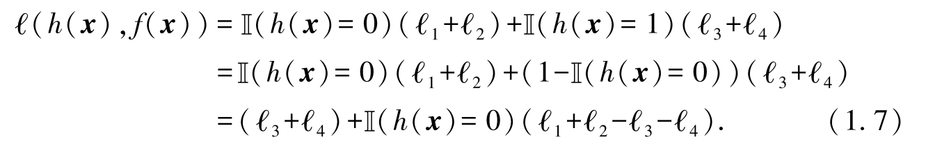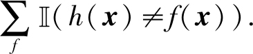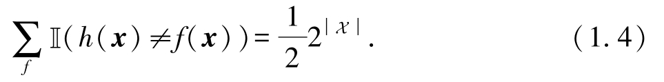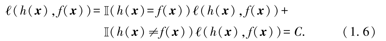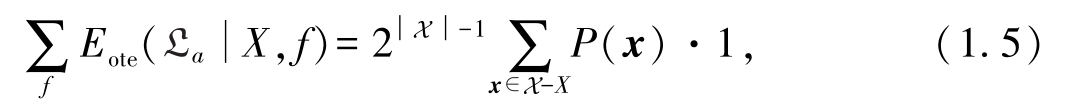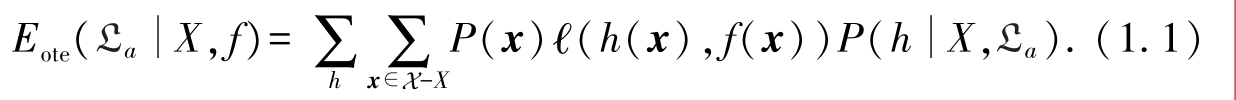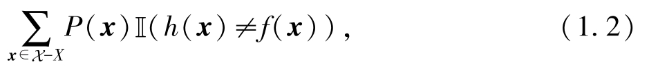 其中 P ( x )表示训练集外数据的分布.例如,数据服从均匀分布,共有5个样本,其中有2个样本在当前假设下预测的结果与真实结果不一致,则误差为2 / 5=0.4.若使用式(1.2)计算,则有0.2×1+0.2×1+0.2×0+0.2×0+0.2×0=0.4,得到同样的结果.