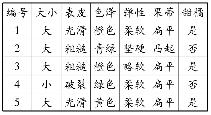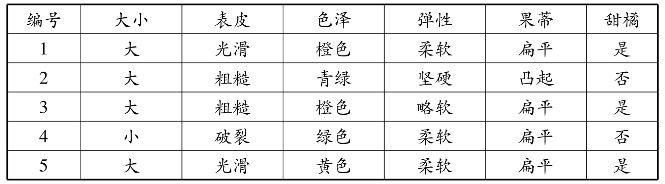 表1.1 橘子数据集,“甜橘”列为标记