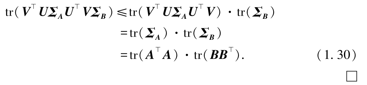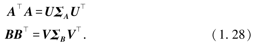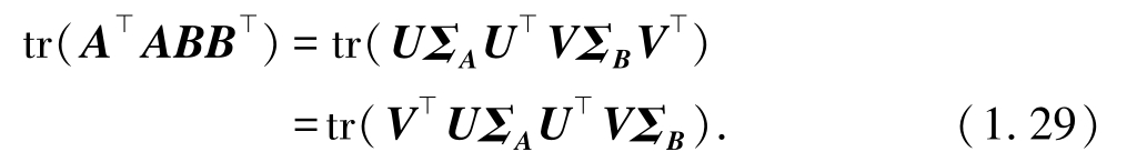 其中 U , V 是正交矩阵,且 Σ A , Σ B 是具有对应矩阵( A ⊥ A )和( BB ⊥ )非负特征值的对角矩阵.再次使用矩阵迹的定义,可以将式(1.27)的左式改写为