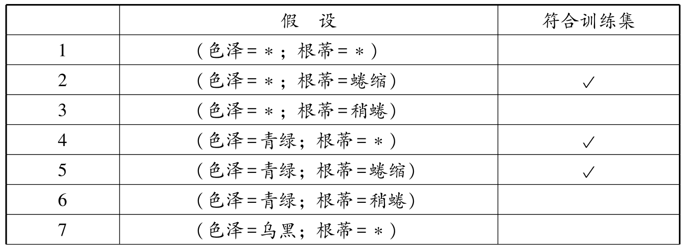 表1.5中枚举出了共10个假设,其中有3个和训练集吻合.因此,该数据集的版本空间为{(色泽=*;根蒂=蜷缩);(色泽=青绿;根蒂=*);(色泽=青绿;根蒂=蜷缩)}.