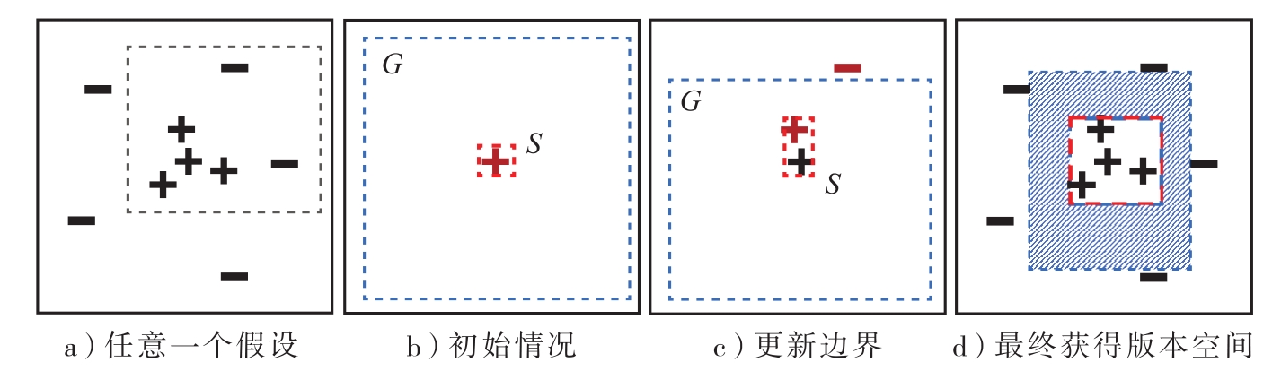 习题注释 版本空间的求解除了可以针对离散的假设空间外,也适用于连续的假设空间.如图1.2a所示,正负号分别表示正例和负例,规定假设为矩形框(框内为正例,框外为负例),虚线框展示了一个可能的假设(由于框内包含负例,因此该假设不在版本空间中).本题中对版本空间的求解可归纳为候选消除算法(candidate elimination algorithm) [ 4 ] .该算法首先寻找一个版本空间 G ,使得不存在其他不在 G 中的假设能够使 G 扩张;同时寻找另一个具体的版本空间 S ,包含最少的满足样例的假设.而 G 和 S 的边界分别为最大泛化边界(maximally general boundary)和最大具体边界(maximally specific boundary),二者构成的区域即为版本空间,如图1.2d所示.算法流程可总结如下,对数据集中的所有样例: