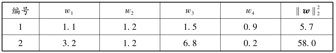 例如,对于两个维数(dimensionality)为4的线性分类器,其各维数的参数取值如表1.7所示: