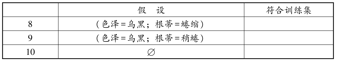 2. 版本空间指与训练集(training set)中的正例一致的假设集合.如果数据的假设空间较小,可以将所有可能的假设枚举出来,根据每个训练样例排除掉不符合的假设,剩下的假设集合即为版本空间.这一求解版本空间的方法也被称为“枚举消除”(list-then-eliminate)法 [ 4 ] .