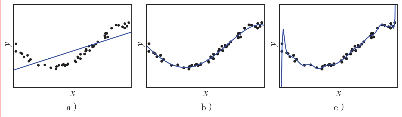 1. 图2.1中的黑色圆点表示训练数据,使用曲线拟合.针对图中的3种情况,请说明模型是否发生“欠拟合”(underfitting)或“过拟合”.