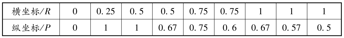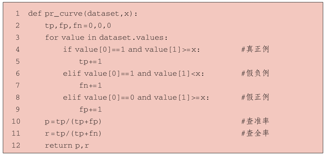 1. P-R曲线的绘制.首先对模型预测结果按照输出值进行排序,保证排序后从前到后样例为正例的可能性逐渐降低.然后,选择(0,0.999)间的1000个数作为判为正例的临界阈值,分别计算这些值下的查全率和查准率.最后,根据这1000组数据绘制出P-R曲线,其中,给定阈值 x 时计算P-R曲线的程序如下: