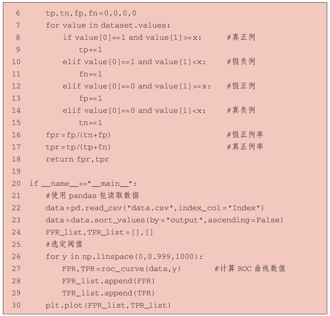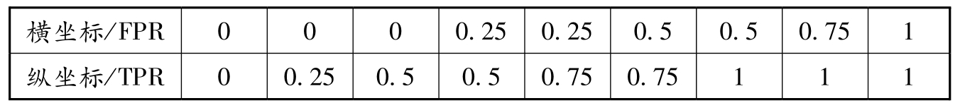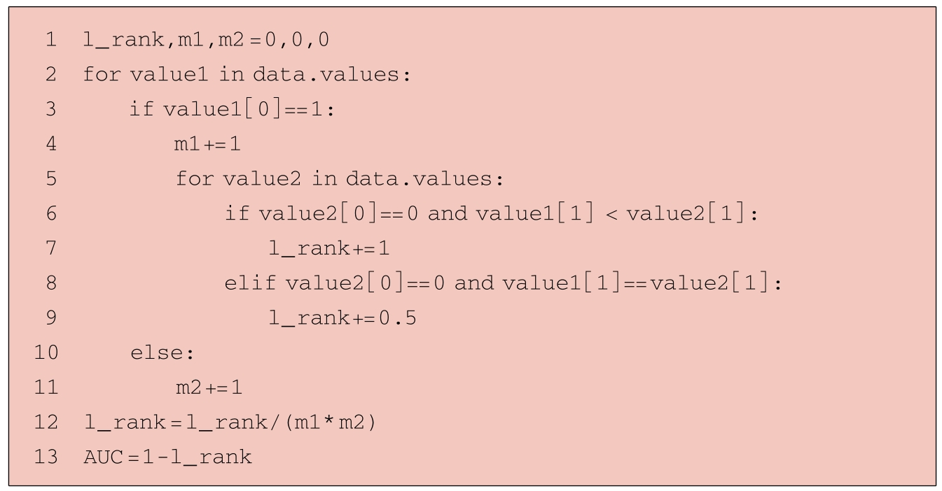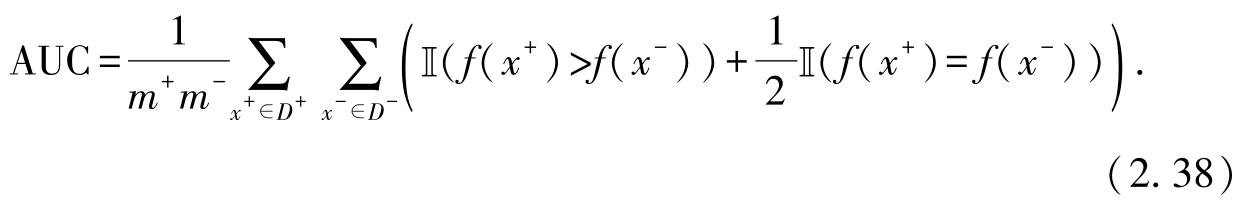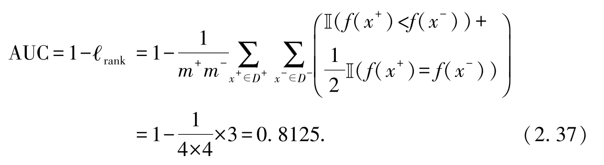 依照式(2.38)计算得到的AUC值约为0.8737.AUC公式计算的实现代码如下: