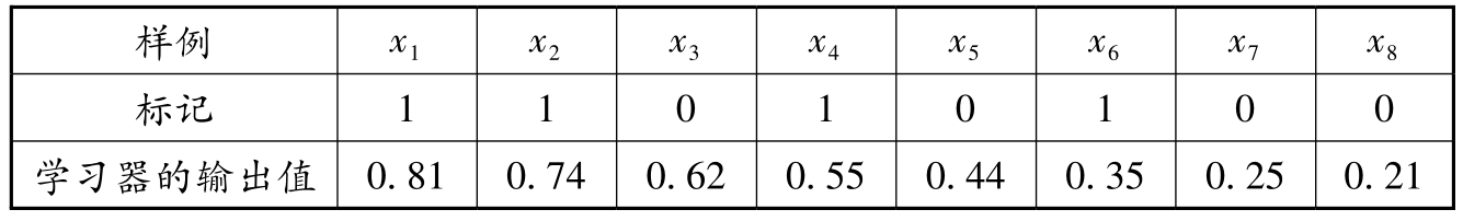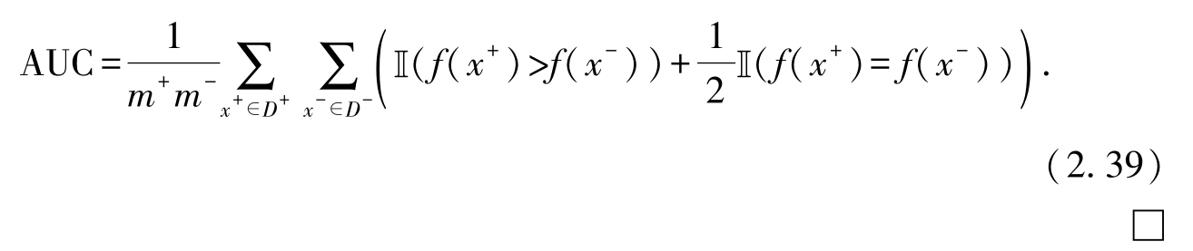 习题注释 本题考查对AUC的理解.AUC的计算有两种方式:一种方式是绘制ROC曲线,计算曲线下的面积;另一种方式是直接比较在模型预测的排序中有多少比例的正例被排在了负例的前面.习题2.7中的AUC结果已验证了这两种计算方式所得的结果一致.