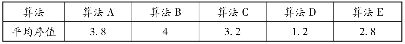 为了验证假设的正确性,需要进行假设检验(hypothesis test).首先,计算不同算法的平均序值(见表2.13),接下来,考虑Friedman检验: