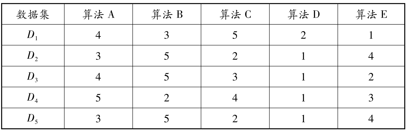 习题2.10 教材2.4节介绍了机器学习中用于比较检验的方法.在数据集 D 1 , D 2 , D 3 , D 4 , D 5 上运行A,B,C,D,E五种算法,算法比较序值见表2.12: