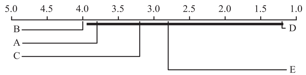 3. 基于上述结果绘制的Nemenyi后续检验图如图2.6所示.首先基于表2.13中的数据绘制每个算法的平均性能.然后以具有最佳平均性能的算法D为起点,以D -CD 为终点,绘制一条临界值域线.可以观察到,这条线与算法A、C、E均有交点,而与算法B无交点.因此可以得出结论,算法D和算法B具有显著差异,而与其他3个算法之间没有显著差异.