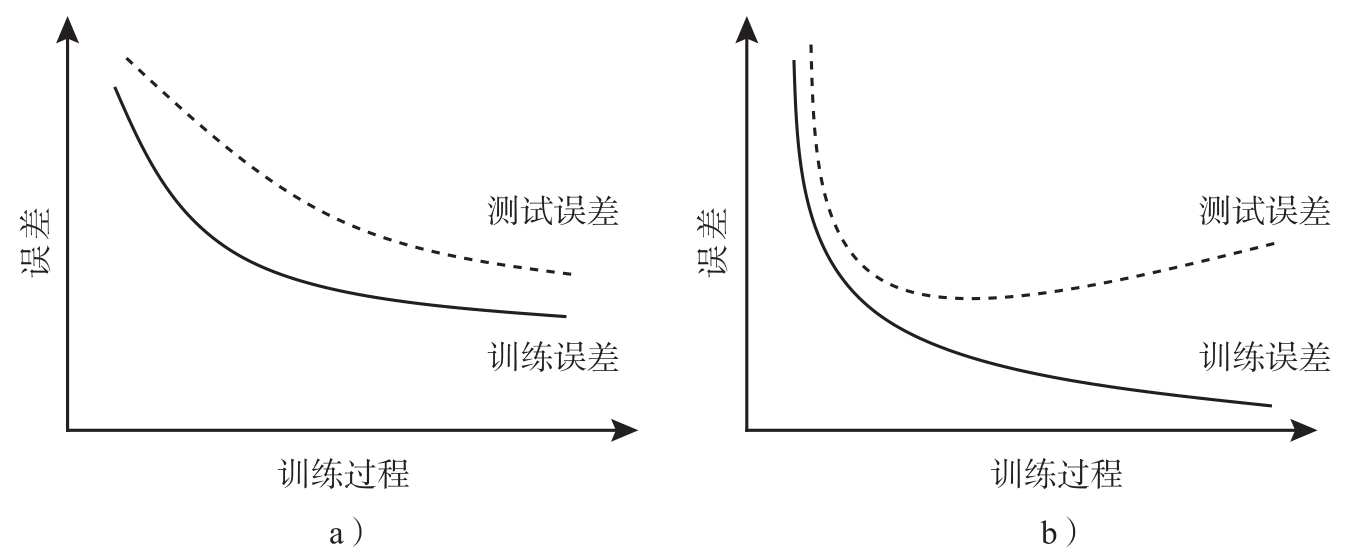4. 图2.3中横轴为训练过程,纵轴为误差.在迭代训练模型的过程中,模型逐步拟合数据,挖掘数据中的规律信息.在图2.3a中训练误差和测试误差都在下降,说明模型在逐步拟合数据,而训练误差在图中仍有下降趋势,说明模型对数据仍未完全拟合,因此发生“欠拟合”.而在图2.3b中,两条曲线的趋势和图2.2a类似,训练误差逐渐降低,而测试误差先降后升,说明随着模型的训练,模型过度描述数据的性质,发生“过拟合”.从本题的分析能够看出,欠拟合比较容易克服,可以进一步训练模型或增加模型复杂度,例如在决策树学习中扩展分支,在神经网络学习中增加训练轮数等.而要克服过拟合相对困难.