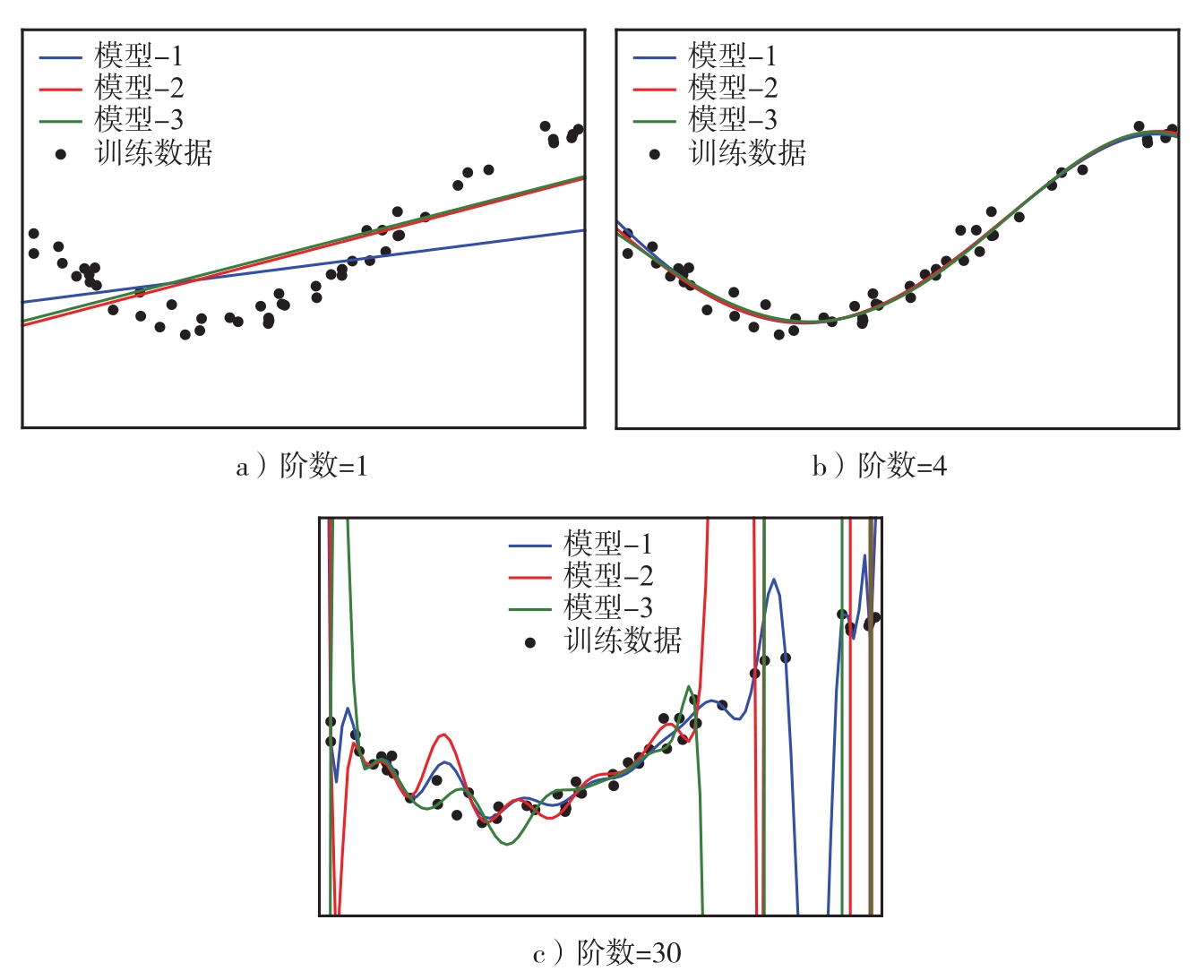 可以看出在图2.7a中,当阶数为1时,使用一条直线拟合数据,此时估计的偏差为0.2,估计的方差为0.01.由于数据本身具有波动趋势,使用线性模型拟合具有较大的偏差,而方差相对较小.当阶数为4时,使用曲线拟合,结果如图2.7b所示,偏差为0.01,方差为0.001.和图2.7a相比,多项式模型更加符合数据本身的趋势,偏差明显减小,方差也有所减小,说明使用当前模型能够获得更好的泛化能力.而在图2.7c中,使用更高阶的多项式拟合数据,发生过拟合,偏差为1.14×10 11 ,方差为1.64×10 14 ,均非常大,说明该模型一方面和真实曲线偏差过大,另一方面不稳定,导致在不同的数据集下产生模型的震荡.