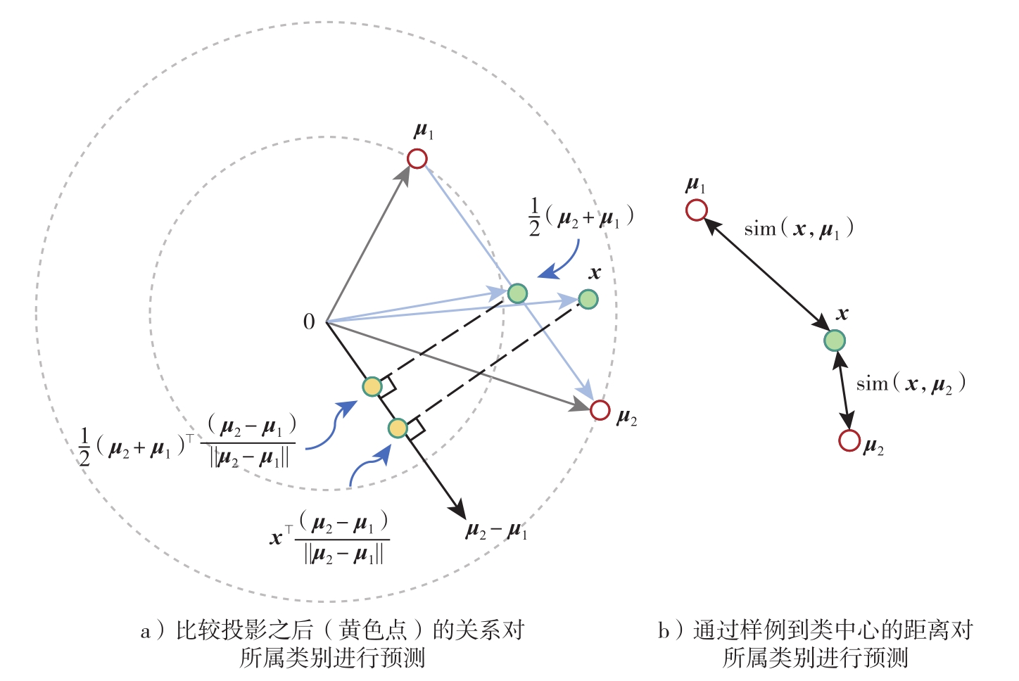 之间的相似度,若样例和某个类别中心非常相似,则将样例预测为对应的类别.在这一特殊情况下,对样例类别的判别转化为对样例和类别中心之间距离的计算.这一类型的分类器也称为最近类中心分类器(Nearest Class Mean,NCM)