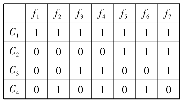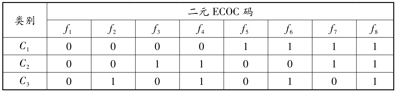 3. 一般而言,当类别数目 N 在3~7之间时,可以按照如下方式构造长为2 N -1 -1的二元ECOC编码 [ 9 ] .首先,第一行中将所有编码元素全部置1;第二行中将2 N -2 个元素置0,剩余2 N -2 -1个元素置1;第三行元素中,依次设置2 N -3 ,2 N -3 ,2 N -3 ,2 N -3 -1个元素为0,1,0,1;在第 i 行中,交替出现多组长度为2 N-i 的取值为0和1的编码.当类别数为4时,得到表3.2中码长为7的编码.