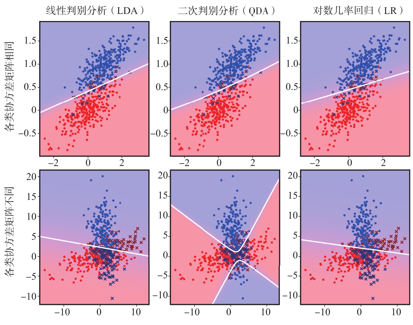的一个二次函数.这一做法被称为二次判别分析(Quadratic Discriminant Analysis,QDA).类似地,可以验证,在QDA的假设下得到的分界面为二次曲面,其结果如图3.5所示.
