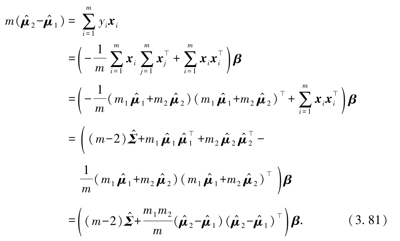 习题注释 本小题考查LDA和线性回归之间的关系.通过设置类别标记数值,LDA的求解和线性回归的求解保持一致.这与习题3.2的第6小题中的结论一致,即线性回归可通过设置标记的形式实现对线性分类问题的求解.