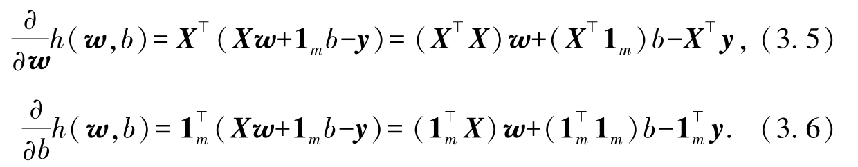 目标函数关于优化变量 w , b 的偏导反映了目标函数随优化变量变化的趋势.当偏导为0时,目标函数达到极值点.对于线性回归问题,能够证明目标函数是关于 w , b 的凸函数,因此偏导为0的解等价于模型的最优解.计算目标函数 h ( w , b )关于 w , b 的偏导: