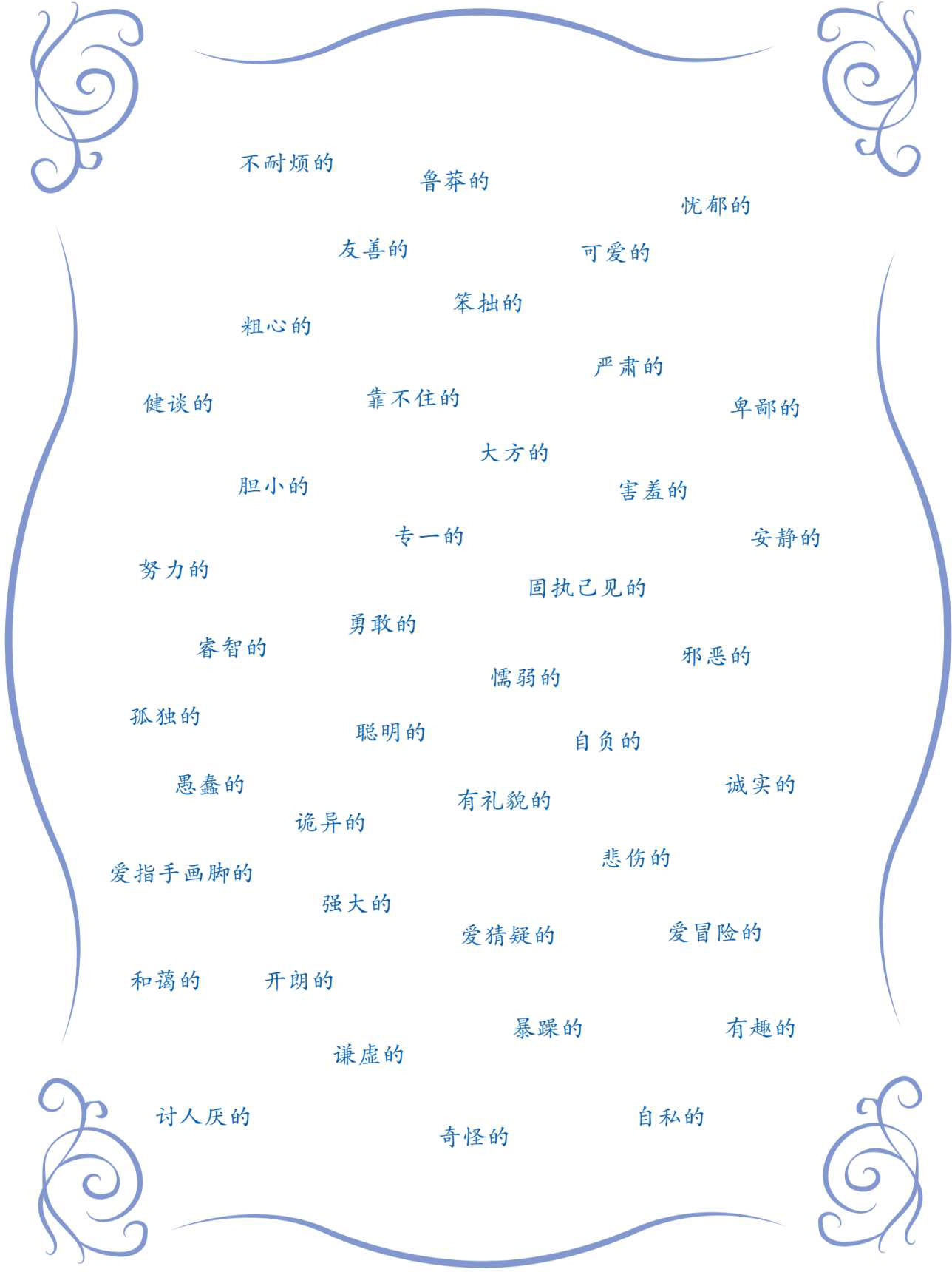 选择故事中的一个人物,圈出你认为可以用来形容他 / 她的词,也可以在空白处添加其他合适的词。你选择的人物是____。
