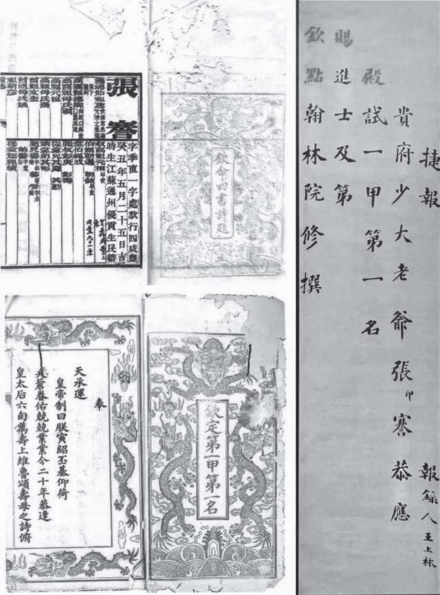 图1-2 考中举人的乡试硃卷、高中状元的殿试策及状元捷报