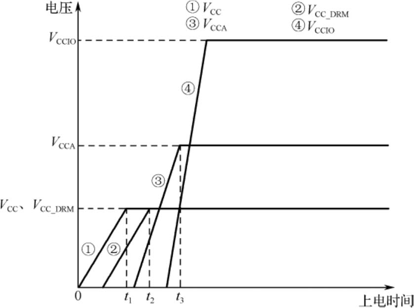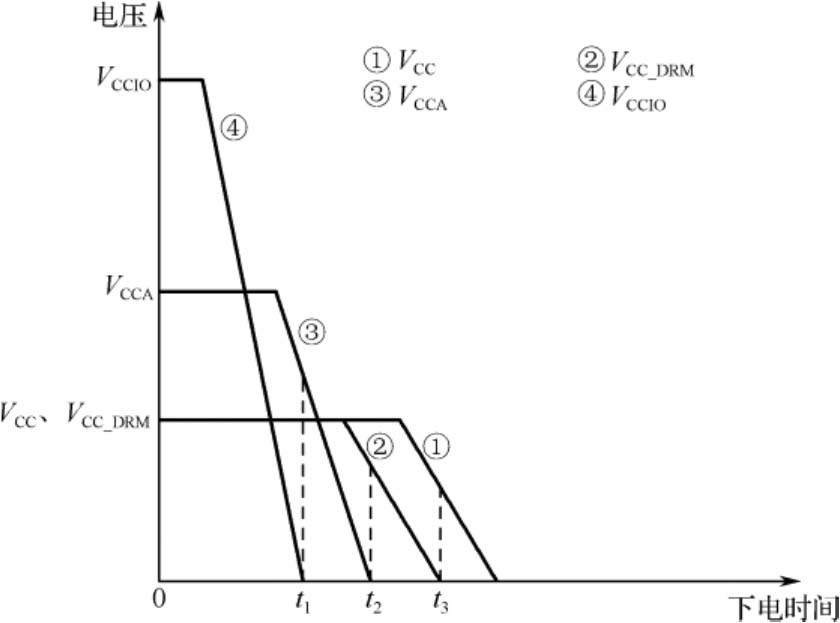 在Logos2系列FPGA的上、下电过程中, V CCIO − V CCA >2V 的时间必须小于100 ms。推荐的上电顺序为 V CC → V CC_DRM → V CCA → V CCIO ,如图3-1所示,各电源的电压在到达典型值前应满足 V CC > V CC_DRM > V CCA > V CCIO 。推荐的下电顺序与上电顺序正好相反,如图3-2所示,各电源电压在到达零值前应满足 V CCIO ≤ V CCA ≤ V CC_DRM ≤ V CC 。