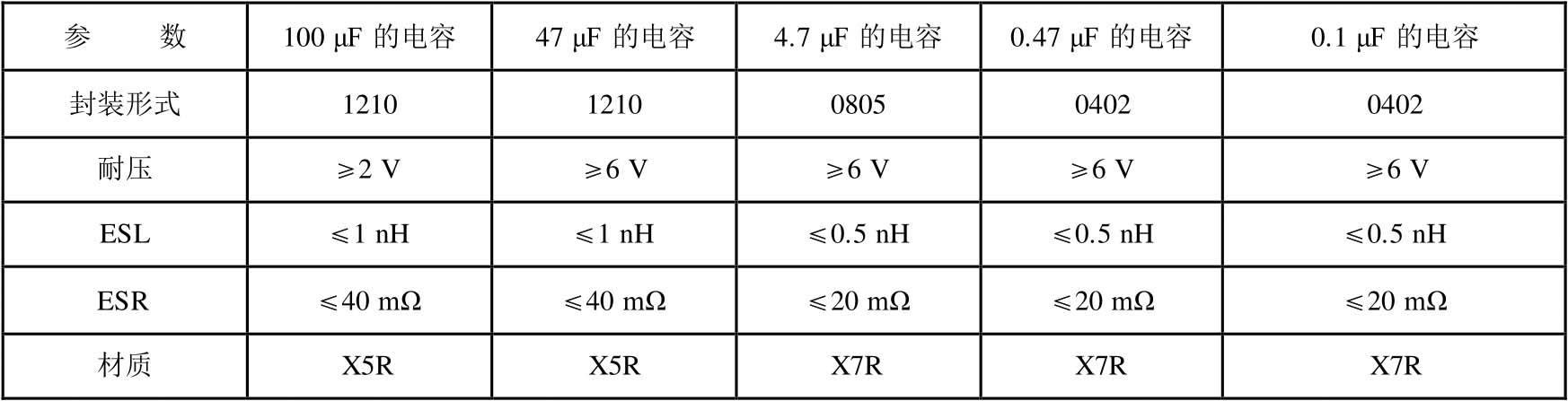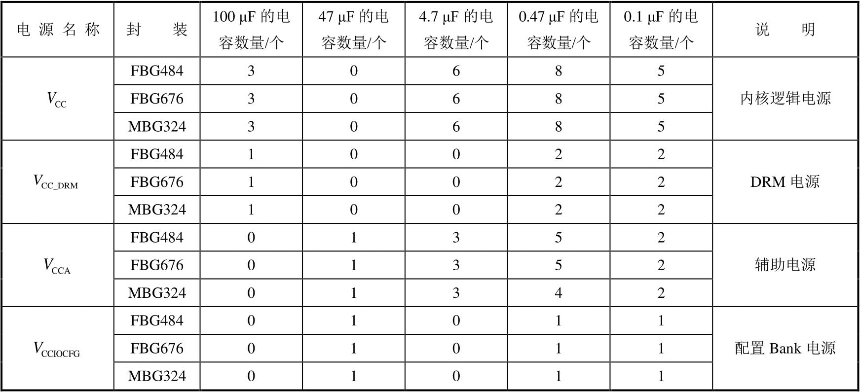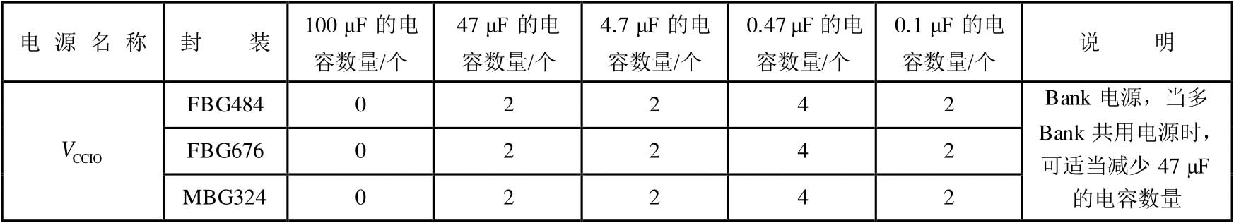 不同型号FPGA的电源对电容要求的数量和参数是不同的,以PG2L100H为例,该FPGA各电源所需的电容数量如表3-3所示,电容的参数如表3-4所示。HSSTLP的电源对电容的需求详见3.4节。