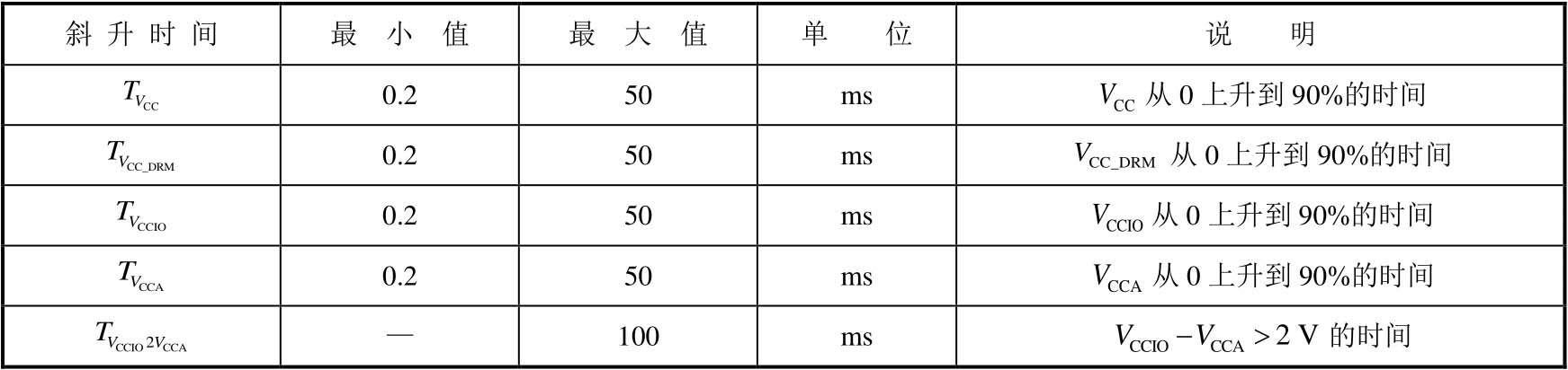 表3-2 Logos2系列FPGA的电源上电斜升时间