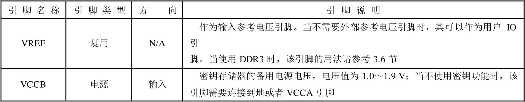 Logos2系列FPGA的VREF和VCCB引脚在硬件设计中需要多加注意,表3-9给出了这两个引脚的说明。