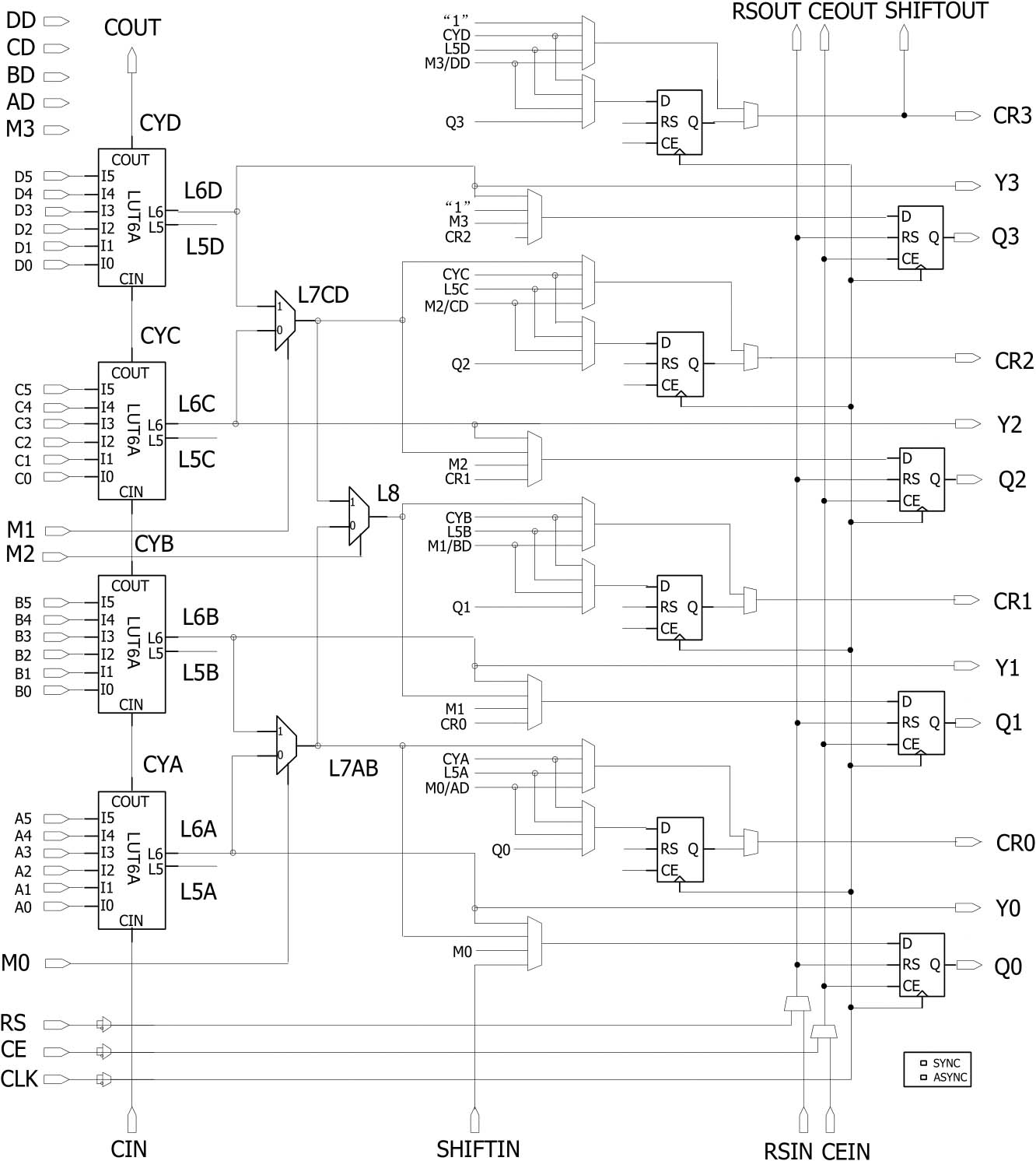 CLMA的逻辑框图如图4-2所示,每个CLMA都包含4个6输入的LUT6、8个寄存器、多个扩展功能选择器、4条独立的级联链等。4条级联链是算术逻辑进位链(从CIN到COUT)、专用移位寄存器链(从SHIFTIN到SHIFTOUT)、寄存器复位/置位级联链(从RSIN到RSOUT)和寄存器CE级联链(从CEIN到CEOUT)。LUT6A(下文中的LUT6A表示CLMA中4个LUT6的统称)采用了创新的架构设计,在6输入查找表的基础上集成了专用电路,以实现4∶1的多路选择器功能和快速算术进位逻辑。扩展功能选择器主要用于实现查找表和输出选择等功能。