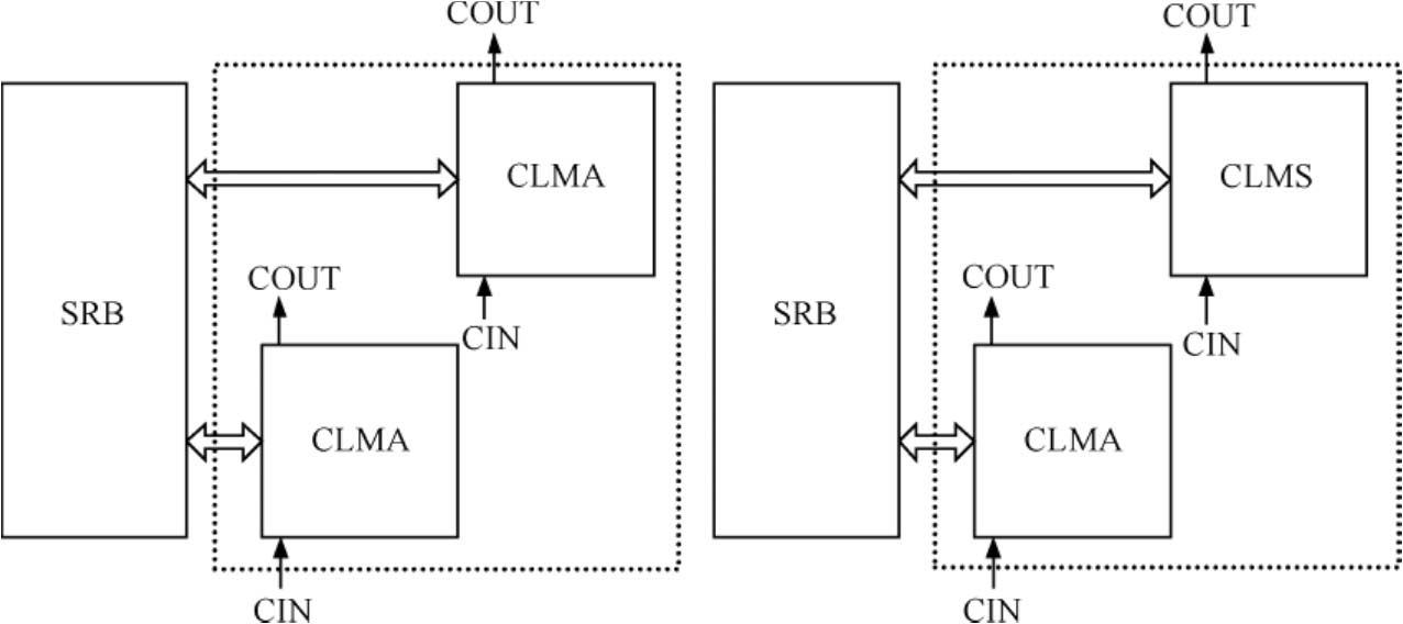 可配置逻辑模块(Configurable Logic Module,CLM)是Logos2系列FPGA的基本逻辑单元。CLM在Logos2系列FPGA中是按列分布的,支持CLMA和CLMS两种形态。CLMA和CLMS均可实现逻辑、算术、移位寄存器和ROM功能,仅CLMS支持分布式RAM功能。CLM与CLM之间、CLM与其他片内资源之间通过信号互连模块(SRB)连接,如图4-1所示。