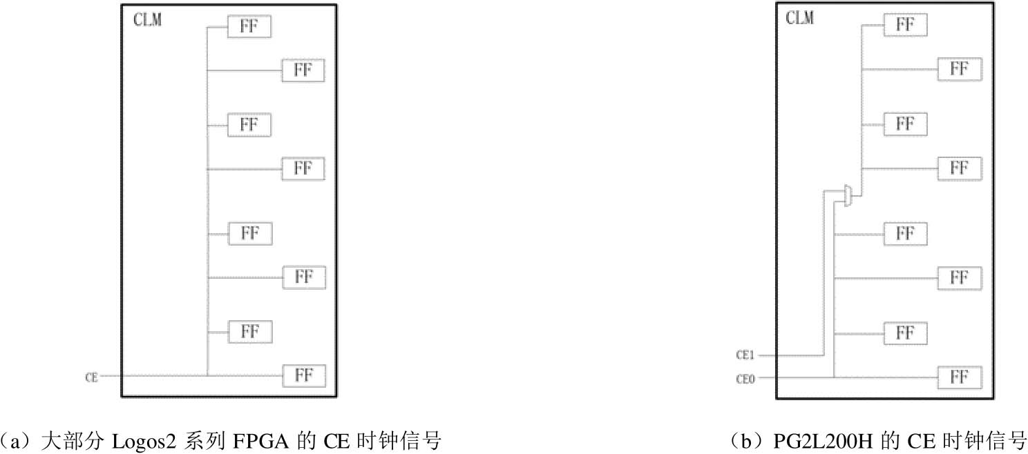 答:CLM中的部分资源是公用的,只使用了内部部分资源时(如占用了RS、CE、CLK等共用资源),剩余资源无法独立使用。大部分的Logos2系列FPGA只有1个CE时钟信号,因此CLM内的8个寄存器必须由同一个CE时钟信号控制;但部分器件(如PG2L200H)的CLM有2个CE时钟信号,可分别控制4个寄存器,因此PG2L200H允许2个独立的CE时钟信号控制1个CLM中上下两个区域的寄存器。大部分Logos2系列FPGA和PG2L200H的CE时钟信号如图4-3所示。