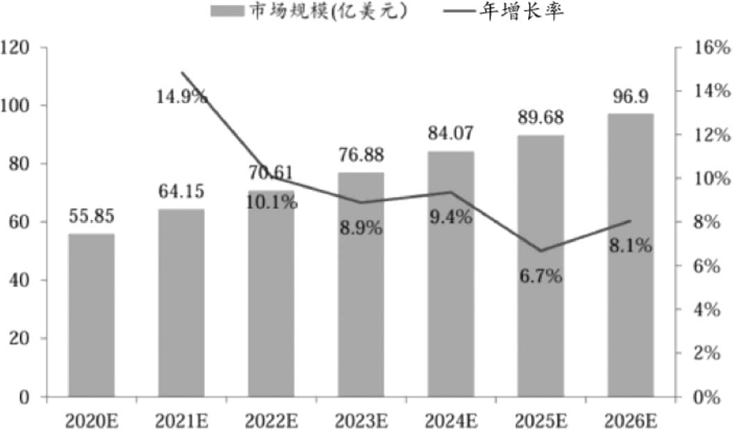 随着数据中心、人工智能、自动驾驶等新兴市场的快速发展,业界对FPGA的需求在持续增长。根据Gartner预测,2020—2026年全球FPGA出货量将从5.11亿颗增至8.25亿颗,复合年均增长率(Compound Annual Growth Rate,CAGR)为8.3%;FPGA市场规模将从55.85亿美元增至96.9亿美元,CAGR为9.6%。全球FPGA市场出货量预测如图1-1所示,全球FPGA市场规模预测如图1-2所示。
