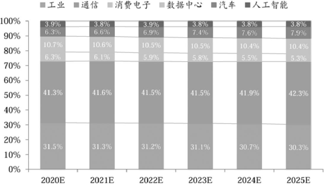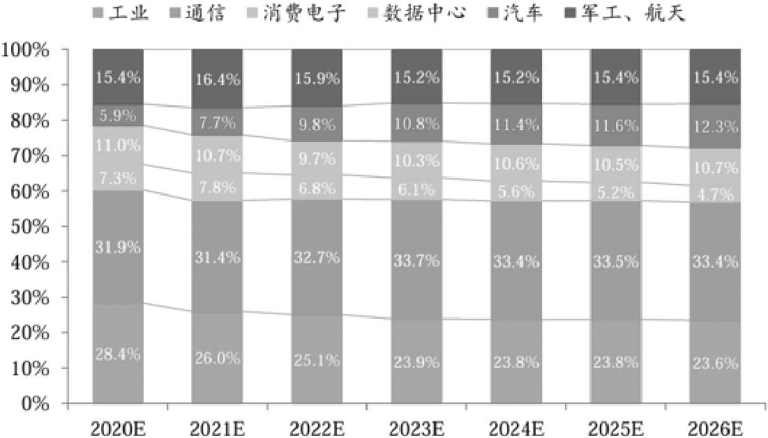 从FPGA芯片的应用分布来看,通信和工业领域占据了市场份额的前两位。其中,通信市场预期将继续扩大,而工业领域的份额则略有缩减。军工与航天市场的应用保持稳定,占比约为15%。在各领域中,汽车市场的增长速度最为显著,其占比将从2020年的5.9%增长至2026年的12.3%。相比之下,消费电子市场的份额最小,虽然FPGA的灵活性适应该领域快速迭代的需求,但受限于规模化效应带来的成本劣势,ASIC在消费电子中的竞争力更强。这也使得FPGA在某些场景下的应用受到周期限制,难以充分发挥其潜力。全球FPGA市场份额如图1-5所示,中国FPGA市场份额如图1-6所示。