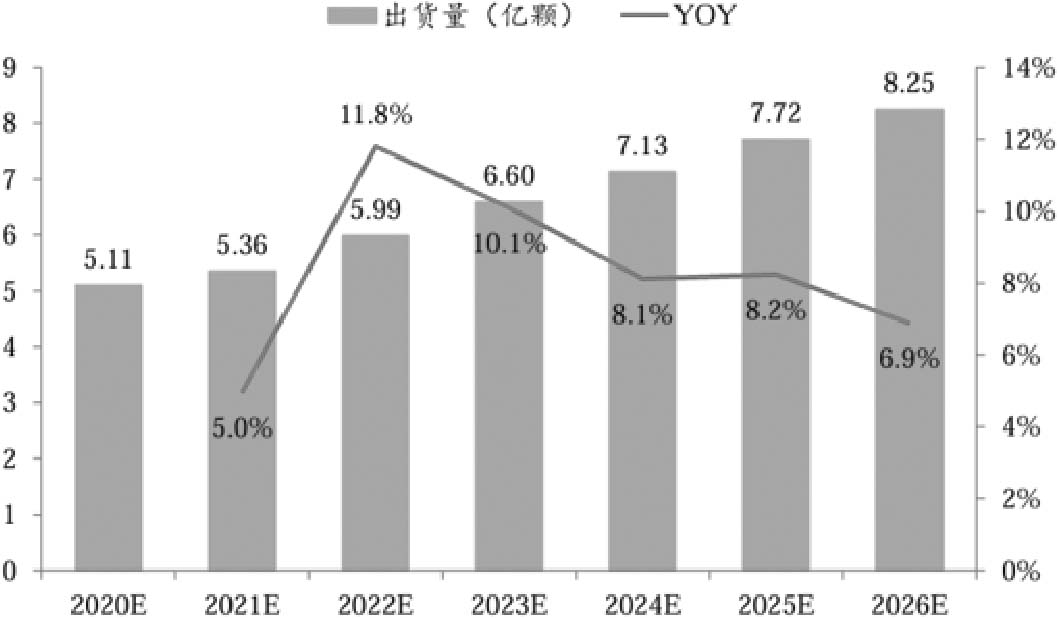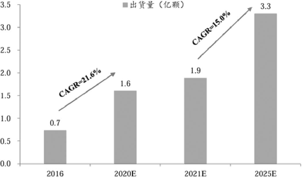 图1-3 中国FPGA市场出货量预测(数据来源:Frost & Sullivan)