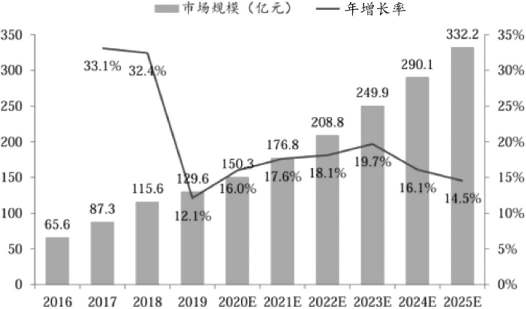 近年来,中国FPGA市场呈现快速扩张态势,增速明显高于全球水平。根据Frost & Sullivan的数据,2020年中国市场FPGA出货量达到1.6亿颗,市场规模达到150.3亿元。随着人工智能等应用领域的快速发展,中国FPGA市场需求预计将继续以全球领先的速度增长。Frost & Sullivan预测,2021—2025年,中国FPGA芯片出货量将从1.9亿颗提升至3.3亿颗,CAGR约为15.0%;市场规模则预计从176.8亿元增长至332.2亿元,CAGR达到17.1%。中国FPGA市场出货量预测如图1-3所示,中国FPGA市场规模预测如图1-4所示。